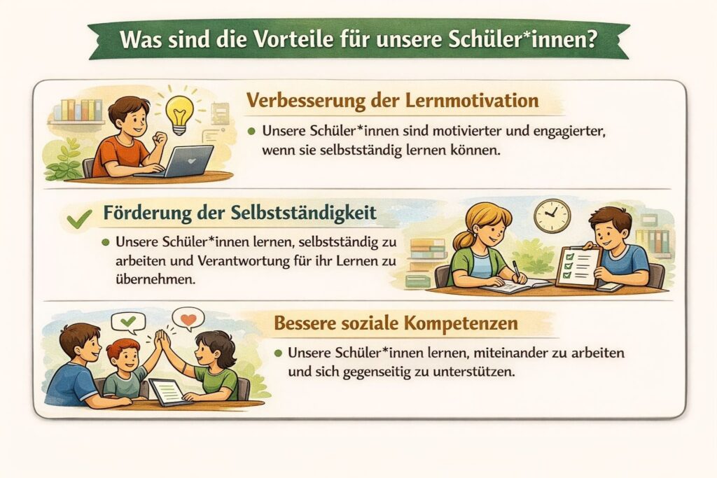 - Verbesserung der Lernmotivation: Unsere Schüler*innen sind motivierter und engagierter, wenn sie selbstständig lernen können.