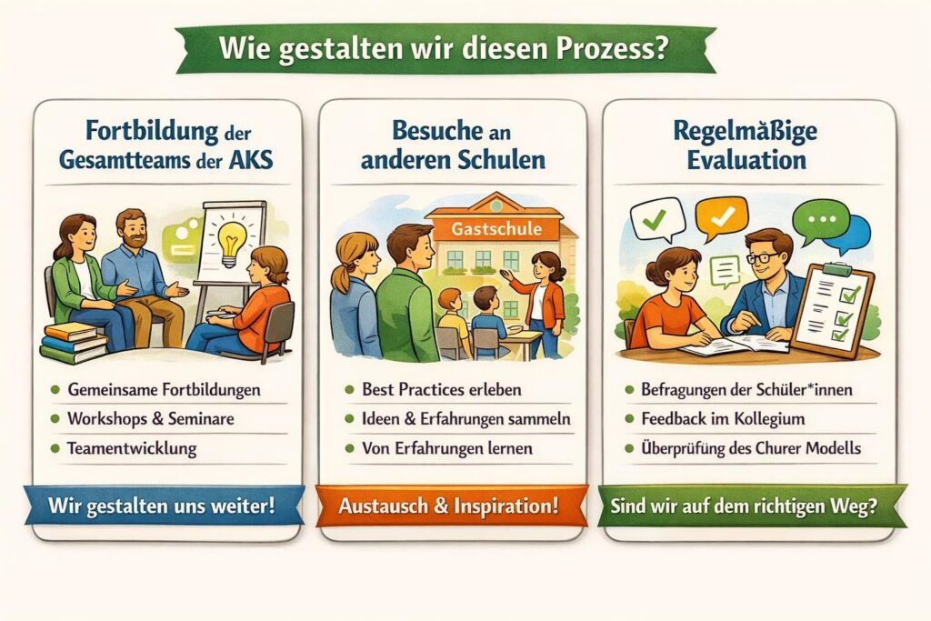 - Wir besuchen andere Schulen, die das Modell schon längere Zeit umsetzen, um weitere Inspirationen zu bekommen und von Erfahrungen zu profitieren.