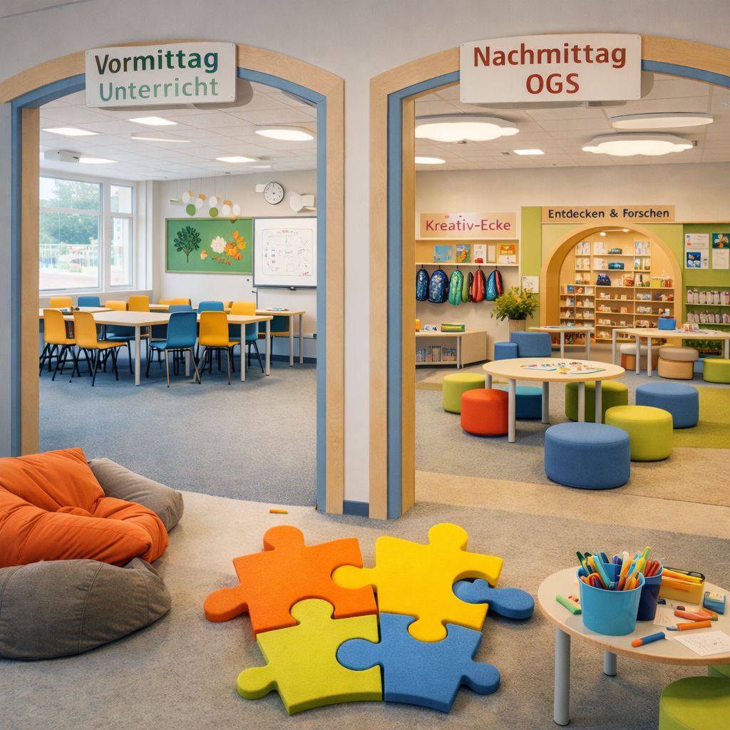 Durch den Rechtsanspruch auf einen Ganztagsplatz für Kinder, die ab Sommer 2026 schulpflichtig werde, beenden wir die Wartelisten. Um die höhere Zahl der Kinder aufnehmen zu können haben die jetzigen ersten Schuljahre in einer Textphase begonnen, den Arbeitsbereich mit Klassenräumen, Grupperaum und Vorraum zu einem „Heimatbereich“ umzugestalten, der von den Ganztagskindern nach Unterrichtsschluss weiter genutzt werden kann. Dies bauen wir in den kommenden Jahren Schritt für Schritt aus.