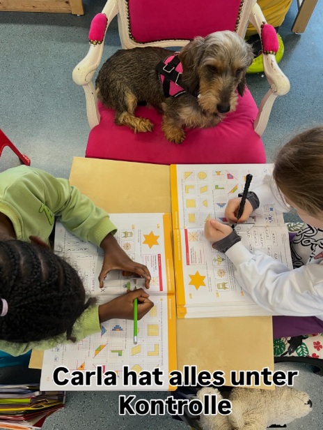 Carla liebt es, den Kindern zu begegnen, gestreichelt zu werden und einfach ein Teil des Schulalltags zu sein. Die Kinder der 3a sind ganz aus dem HĂ€uschen und freuen sich jeden Freitag auf ihren Besuch. Neben dem Lernen bringt Carla Freude, Entspannung und ein bisschen Hunde-Charme in den Schulalltag. Auch im Unterrichts- und Lesekontext bringt sie sich mit ihrer ruhigen Art ein.