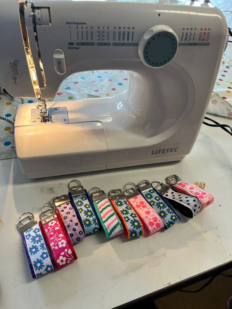 Von einfachen Schlüsselanhängern bis hin zu kleinen Stofffiguren – wir nähen alles, was uns einfällt. Die Kinder haben bereits viele tolle Ideen entwickelt und wir arbeiten daran diese Projekte umzusetzen. So haben wir zum Beispiel für die Schule neue Aufsichtsbänder genäht.