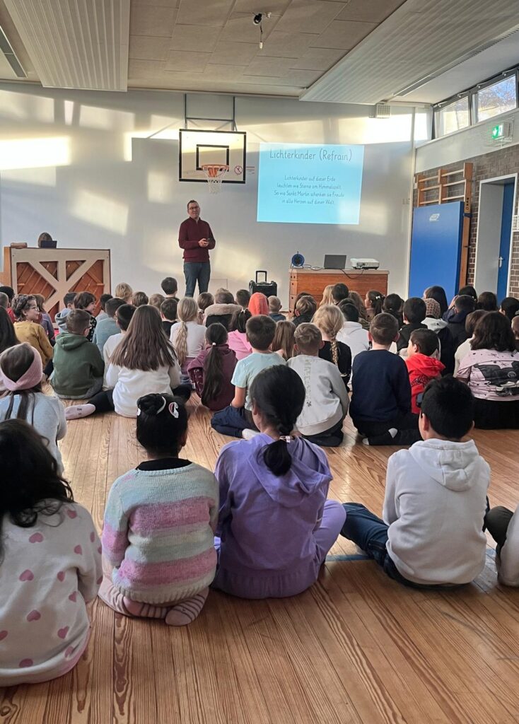 Vormittags stimmten die Lehrkräfte den Sankt Martin Tag ein und versammelten die Kinder in der Turnhalle. Mit Unterstützung von dem Gemeindereferenten Jan Hendrik Ilk wurden die Kinder durch die Sankt Martin Geschichte geführte, stimmte passende Lieder an und er sprach mit den Kindern über die Wichtigkeit und die Bedeutung des Teilens. Die Kinder sangen laut mit und hatten die Schönsten Ideen zum Thema Teilen. Neben Essen, Geld und Socken sollten auch gute Gefühle wie Liebe und Freude miteinander geteilt werden.