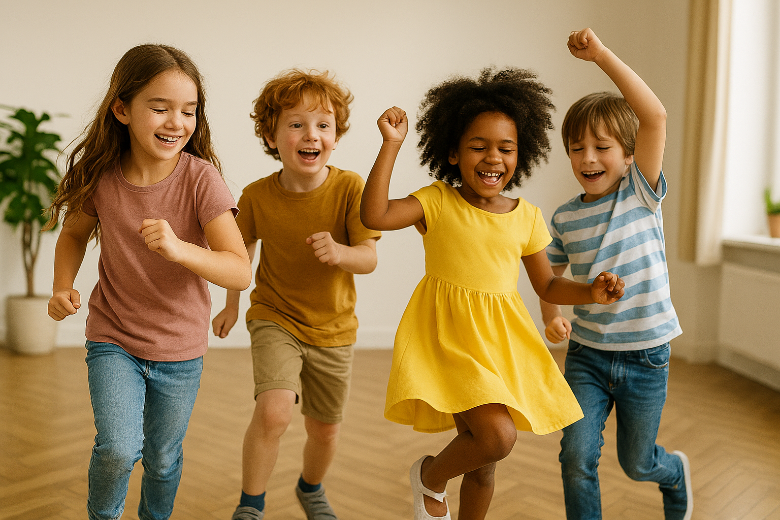 Hier geht es nicht um Perfektion, sondern um Freude an der Bewegung. Die Kinder toben, hüpfen, drehen sich und haben jede Menge Spaß miteinander.